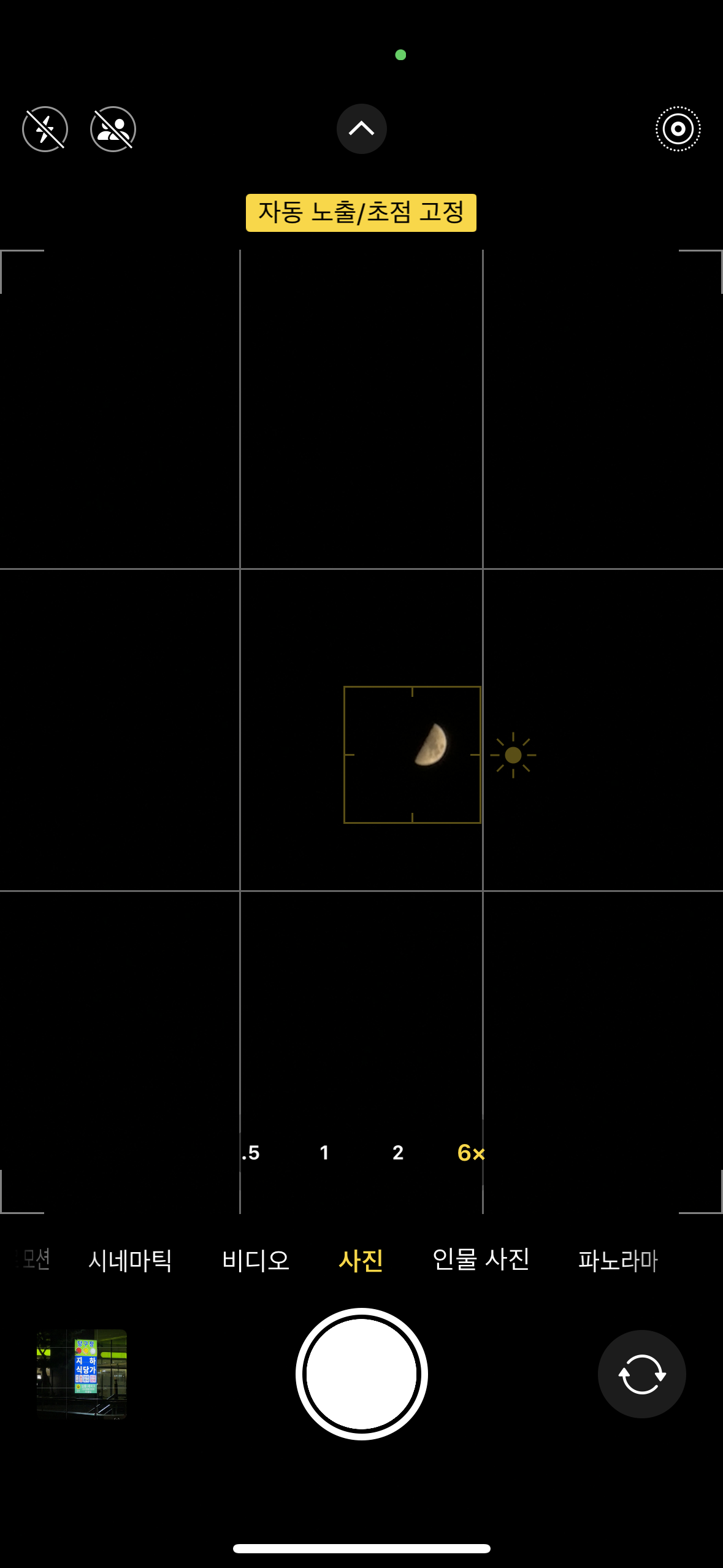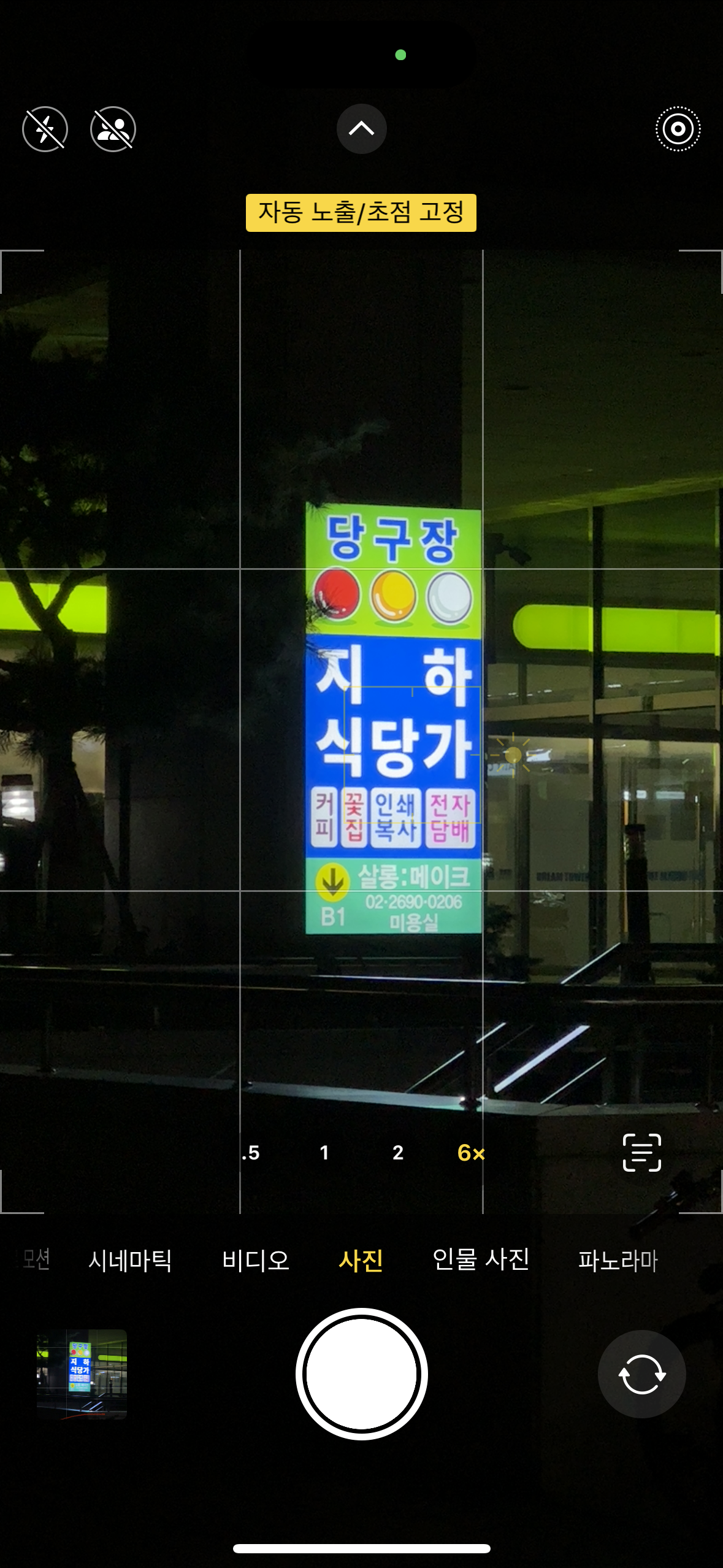 한 10미터 정도 떨어진 광원(간판 등)에 카메라를 맞추고 화면을 길게 누릅니다. 어느정도 줌을 땡기고 초점을 맞추면 더욱 좋습니다. 그러면 초점이 고정됩니다.