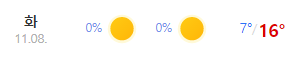 구름 없음, 7~16도 (네이버 날씨 기준)